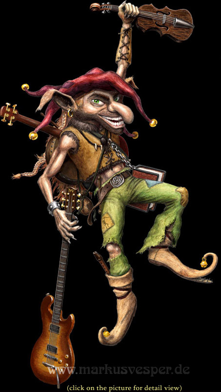 Maskottchen für die Band Lack Of Limits (ursprünglich in anderer Pose von Marcus Friedeberg gezeichnet), 2007, Aquarell-, Acrylfarben und Pastellkreidestifte, 42cm x 25cm. Saiten, sowie die Silhouette auf dem Flicken am Computer erstellt.